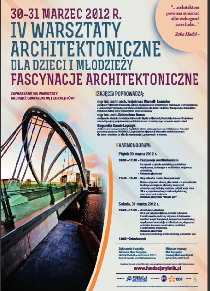 W dniach od 30 do 31 marca w "Klubie energetyka: Fundacji Elektrowni Rybnik będą odbywały się IV Warsztaty Architektoniczne dla Dzieci i Młodzieży pod nazwą "Fascynacje architektoniczne". - Podczas warsztatów poznajemy i odkrywamy piękno zabudowanego świata wokół nas - zachęcają organizatorzy.