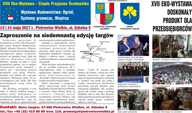 Tematyka walki ze smogiem oraz likwidacji niskiej emisji zdominuje tegoroczną pietrowicką Eko Wystawę. Jak co roku spodziewanych jest około 200 firm prezentujących swoją ofertę i 30 tys. zwiedzających, a do tego zadbano o atrakcyjny program rozrywkowy. Gmina zaprasza wystawców. TUTAJ można znaleźć pełne informacje.
