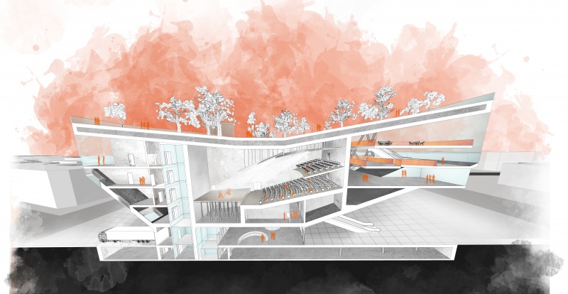 Kopenhaga jest miastem, które stale się rozwija. Dynamizm miasta został odwzorowany w projektowanym obiekcie poprzez jego niecodzienną formę. Dwie krawędzie budynku zostały podniesione aby uwolnić przestrzeń placu, natomiast zielony dach górujący ponad innymi budynkami zapewnia widok na panoramę miasta. Na poszczególnych piętrach znajdują się również tarasy widokowe pozwalające chłonąć widoki stolicy. Cały budynek sprawia wrażenie unoszącego się nad ziemią, a dzięki licznym przeszkleniom i ażurowej konstrukcji, umożliwia przechodniom obserwowanie jego codziennej pracy. Sala audytoryjna jako serce budynku umieszczona jest w jego centrum co pozwala na odizolowanie jej od hałasu pochodzącego z zewnątrz oraz rozplanowanie otaczających ją przestrzeni w funkcjonalny sposób. Budynek zaprasza gości do oglądania wystaw, wciągając ich do środka za pomocą ruchomego chodnika.