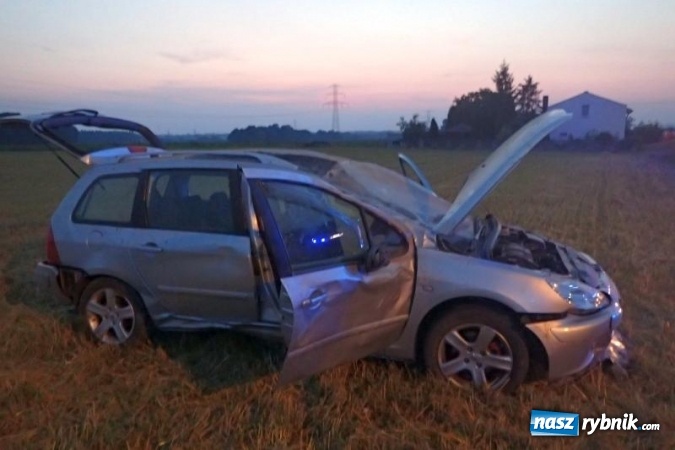 Peugeot 307 wypadł z jezdni i dachował na pobliskim polu